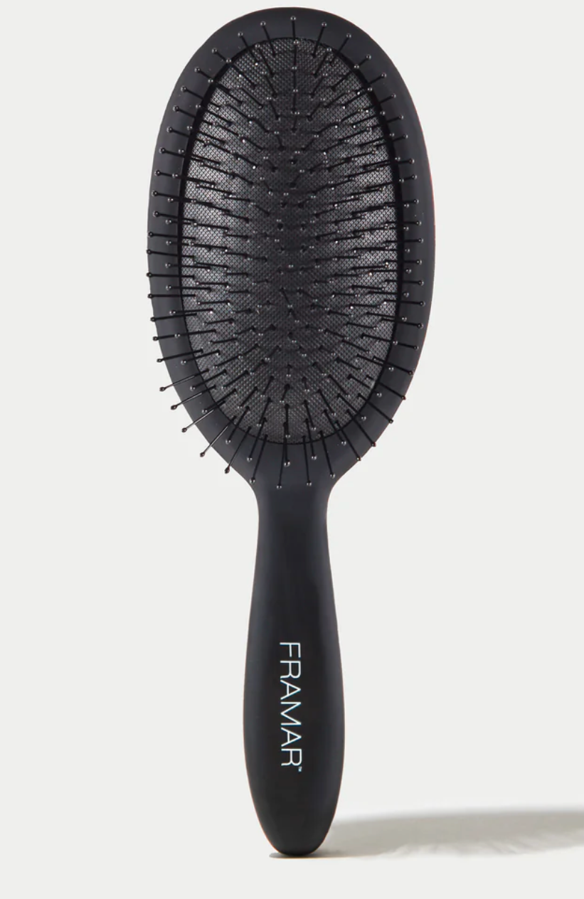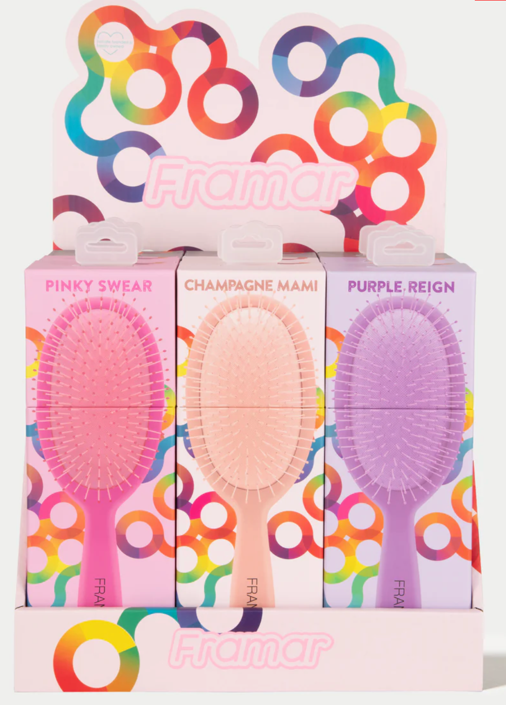 Brosse démêlante Framar : démêle vos cheveux en douceur pour une chevelure lisse et sans nœuds au quotidien ( choisissez votre couleur : Purple Reign, Champagne Mami, Black To the Future ou Pinky Swear. Veuillez indiquer votre choix dans les notes lors de votre commande, sinon l’équipe BAE en choisira une pour vous !).